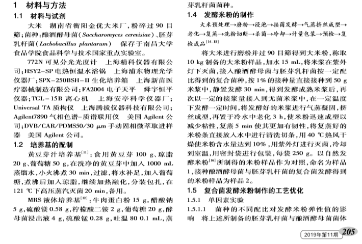 近期,南昌大学食品科学与技术国家重点实验室在《食品工业科技》期刊2019年第11期发表题为“复合菌发酵米粉的制作工艺优化及其香气成分”的文章,文章中使用Universal TA质构仪来测定米粉的弹性。
