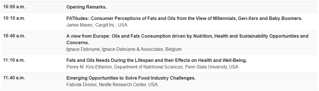 This session is aimed to discuss the consumer’s fat and oil choices in different geographies and their knowledge on health effects of fats and oils, nutritional needs of fats and oils during life span, offerings as well as approaches of food manufacturing companies to the customer needs.