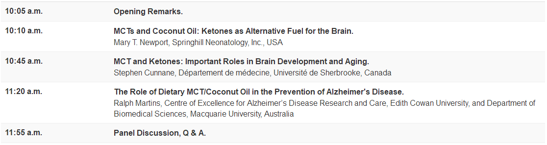 There is growing awareness of the importance of medium-chain triglycerides (MCTs) and their usefulness throughout the lifespan in health and disease. MCT oil is added to infant and follow-on formulas, nutritional foods for athletes, foods for surgical patients; foods for the elderly, for children and adults with malabsorption syndromes; foods for weight control and even for Alzheimer’s disease (AD). This session will review the use of MCTs by focusing on how they help prevent and benefit AD, and coconut oil will be discussed regarding its properties that could ameliorate the effects of AD.