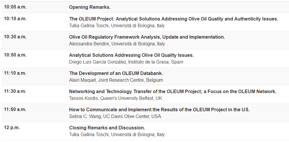 The EU H2020 OLEUM project runs from 2016 to 2020 and aims to better guarantee olive oil (OO) quality and authenticity by improving detection and prevention of olive oil fraud. To solve these gaps, thus enhancing the competitiveness of the OO market both within and outside the EU, the project will develop innovative and revise existing analytical methods, share relevant results, and establish a wide community of institutions involved in the olive oil sector.