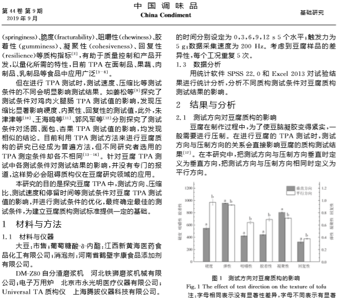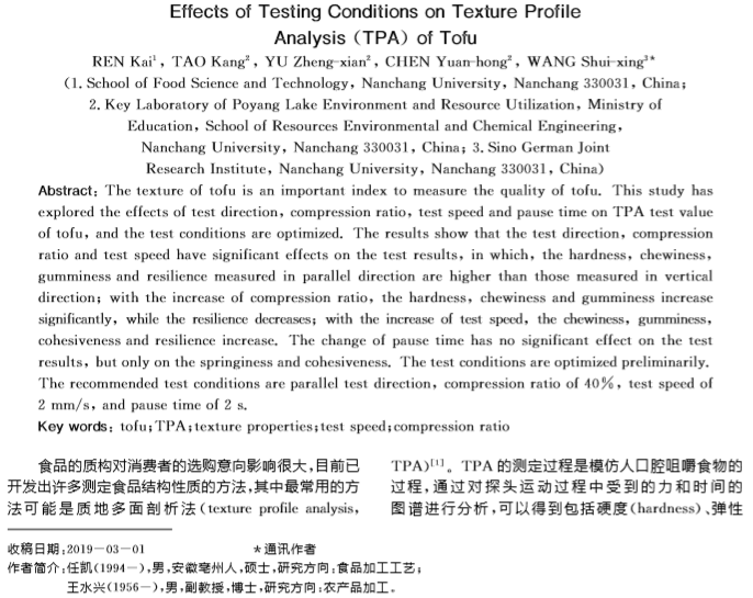 Technical articles2019年9月,《中国调味品》期刊在线发表了南昌大学题为“TPA测试条件对豆腐质构测试结果的影响”的文章,在文章中,研究人员使用上海腾拔Universal TA质构仪测定豆腐的硬度、弹性、回复性、咀嚼性等指标。