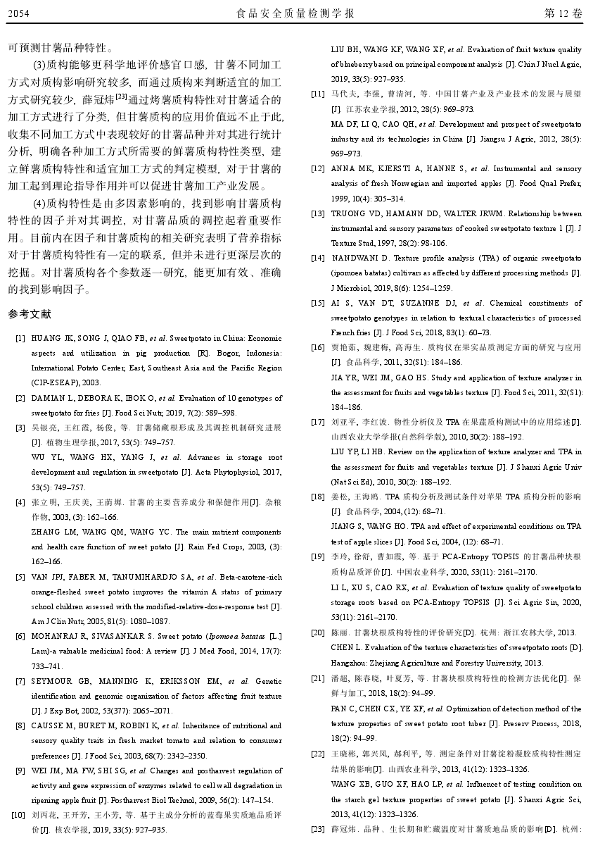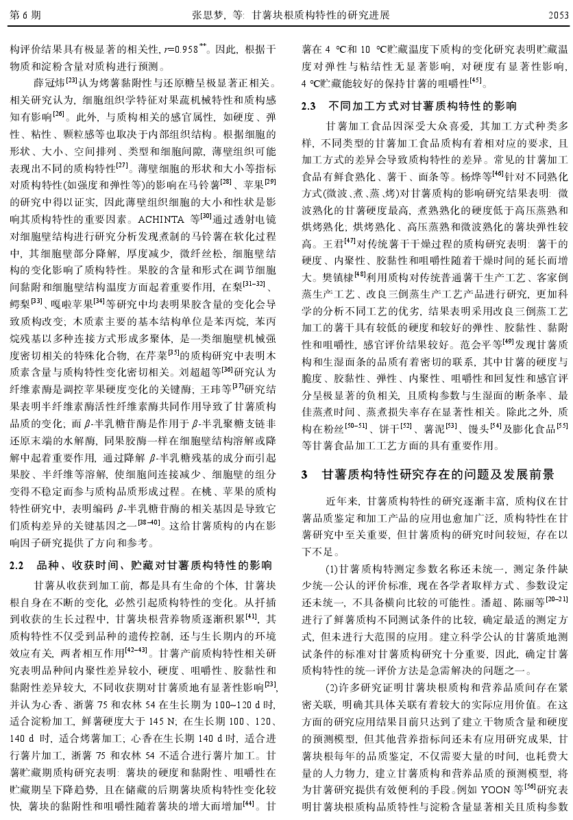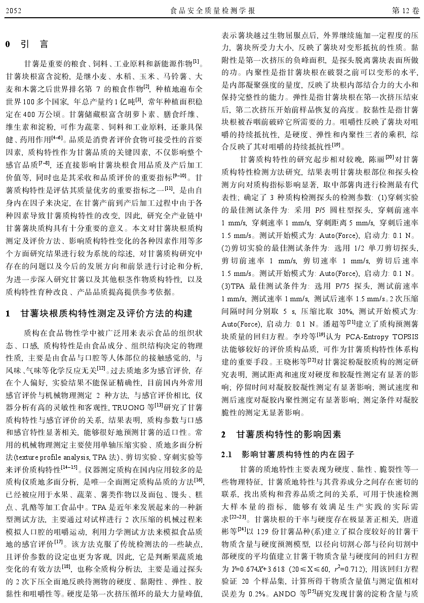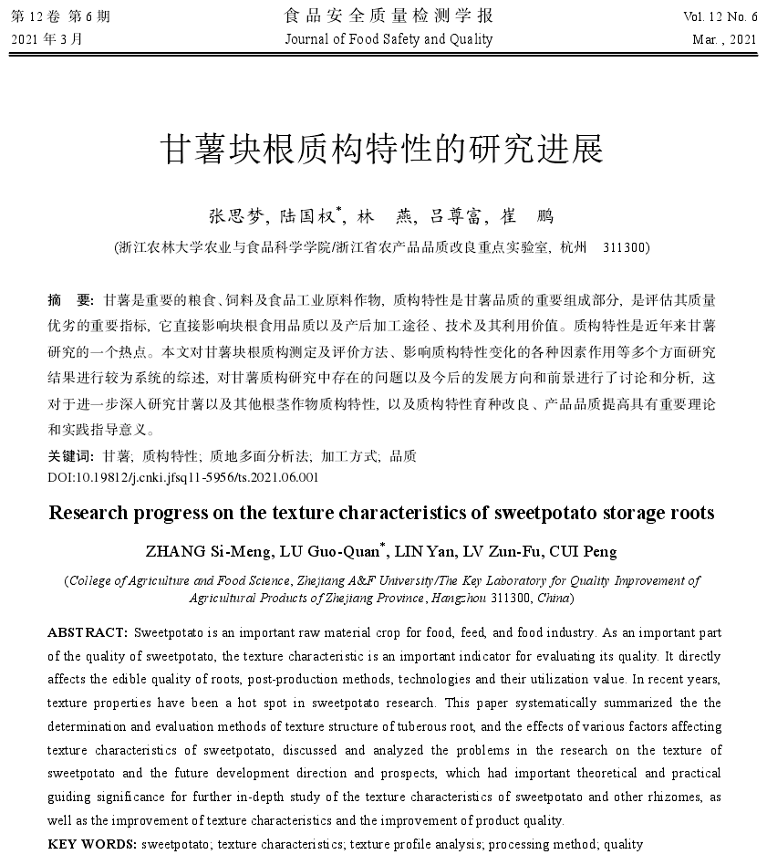 甘薯是重要的粮食、饲料、工业原料和新能源作物。甘薯块根富含淀粉,是继小麦、水稻、玉米、马铃薯、大麦和木薯之后世界排名di7的粮食作物,种植地遍布100多个国家,年总产量约1亿吨,常年种植面积稳定在400万公顷。甘薯储藏根富含胡萝卜素、膳食纤维、维生素和淀粉,可作为蔬菜、饲料和工业原料,还兼具保健、药用作用。品质是消费者评价食物可接受性的首要因素,质构特性作为甘薯品质的关键因素,不仅影响整个感官品质,还直接影响甘薯块根食用品质及产后加工价值等,同时也是其采收和品质评价的重要指标。甘薯质构特性是评估其质量优劣的重要指标之一,是由自身内在因子来决定,在甘薯产前到产后加工过程中由于各种因素导致甘薯质构特性的改变,因此,研究全产业链中甘薯薯块质构具有十分重要的意义。本文对甘薯块根质构测定及评价方法、影响质构特性变化的各种因素作用等多个方面研究结果进行较为系统的综述,对甘薯质构研究中存在的问题以及今后的发展方向和前景进行讨论和分析,为进一步深入研究甘薯以及其他根茎作物质构特性,以及质构特性育种改良、产品品质提高提供参考依据。
