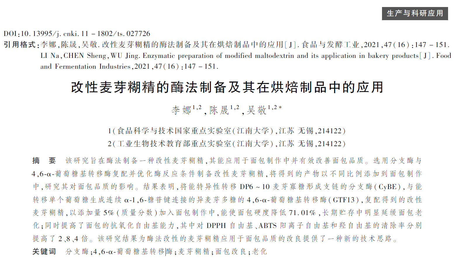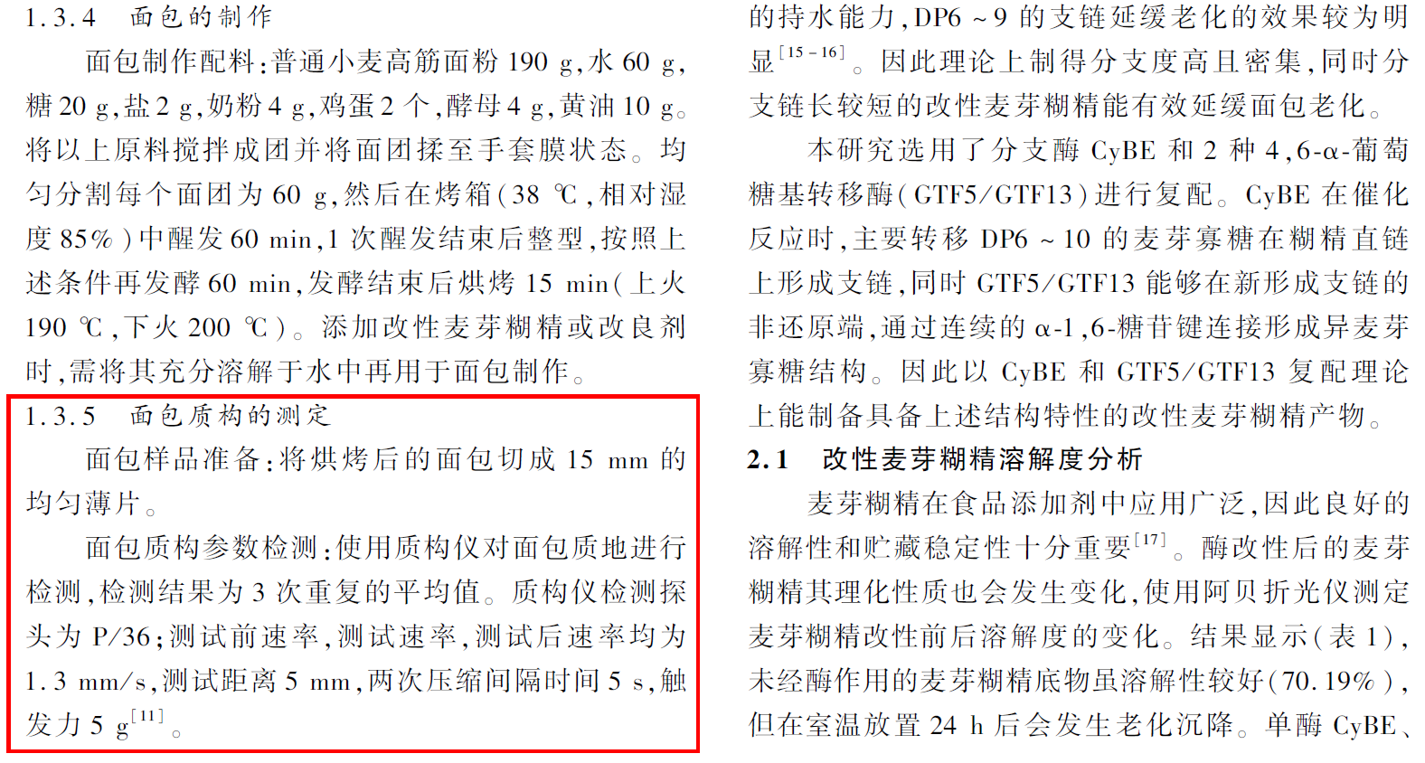 Technical articles2021年,江南大学食品科学与技术国家重点实验室研究人员在国内期刊《食品与发酵工业》发表了题为“改性麦芽糊精的酶法制备及其在烘焙制品中的应用"的研究论文。在该论文中,研究人员用上海腾拔Universal TA质构仪测定面包的硬度。
