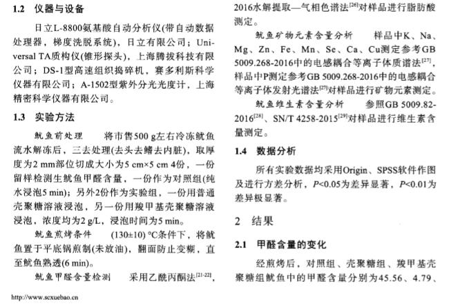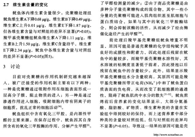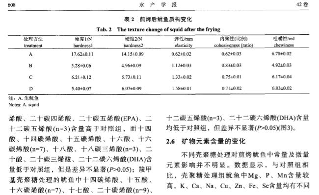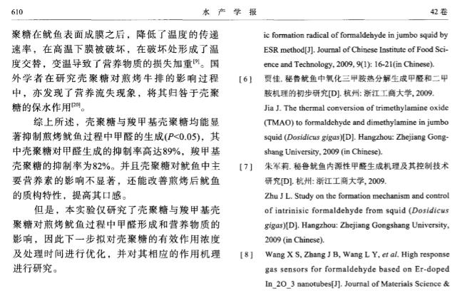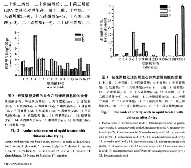 摘要 :为减少煎烤鱿鱼在制作过程中的营养损失和 甲醛的生成。实验采用2g/L的壳聚糖 溶液( 普通壳聚糖和羧甲基壳聚糖) 浸泡处理新鲜 巨型枪乌贼( 秘鲁鱿鱼) 5mi n,再进行高 温煎烤。甲醛检测的结果显示,煎烤后对照组( 纯水浸泡) 、壳聚糖组、羧甲基壳聚糖组 鱿鱼中的甲醛含量分别为45.56、4.79、8.3 0mg/kg,各组之间差异极显著。煎烤前后鱿鱼 中几种营养素的检测结果显示,壳聚糖组中天冬氨酸、丝氨酸、脯氨酸、胱氨酸、赖氨 酸、十二酸、十五酸、十七酸、十八碳烯酸( n =9 ) 、十八碳烯酸( n =6 ) 、亚油酸( n =6 ) 、二 十碳烯酸( n =9 ) 、二十碳二烯酸、二十碳 四烯酸、二十碳五烯酸( EPA) 、二十二碳五烯酸 ( n =3 ) 及元素Mg、P、Mn和维生素C含量高于对照组,其他营养素含量较对照组低。羧 甲 基壳聚糖组中天冬氨酸、丝氨酸、甲硫氨酸、亮氨酸、赖氨酸、组氨酸、十四碳烯酸、十五酸、十六碳烯酸( n =7 ) 、十七酸、花生烯酸( n=9) 、二十碳二烯酸、二十碳四烯酸、二十碳五烯 酸( EPA) 及 元素K、Mg、P、Zn、Mn、Se和 维生素B含 量高于对 照组 ,其他 营 养素含量较对照组低。另外,EPA及7种人体必需氨基酸在壳聚糖组的含量高于羧 甲基 壳聚糖组。研究表 明,2种壳聚糖均能有效抑制鱿鱼在煎烤过程中甲醛的生成,普通壳 聚糖效果更显著,并且能较好地保持鱿鱼的品质。
