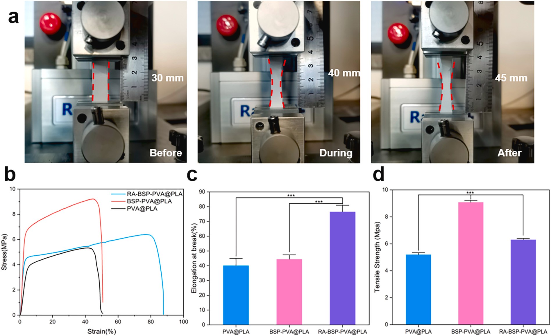 RA-BSP-PVA@PLA应力应变行为(a)、同轴纳米纤维的应力-应变曲线(b)、三个不同同轴纳米纤维断裂伸长率(c)和三个不同同轴纳米纤维拉伸强度(d)
