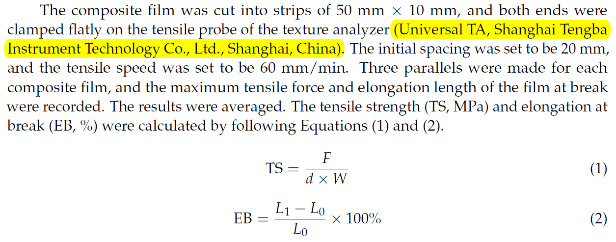 Technical articles近日,山东大学海洋学院研究人员在国际食品期刊《Foods》(Q1,IF=5.561)发表了题为"Preparation and Properties of Blended Composite Film Manufactured Using Walnut-Peptide–Chitosan–Sodium Alginate"的研究论文。在该论文中,研究人员使用上海腾拔Universal TA研究型质构仪测定了复合可食用膜的拉伸强度和断裂伸长率。