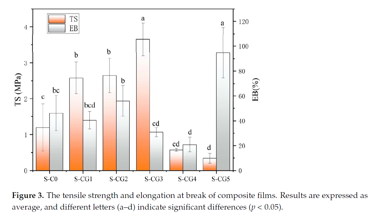 3、复合可食用膜的拉伸强度和断裂伸长率结果