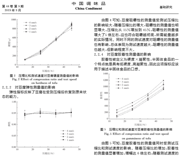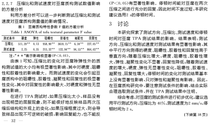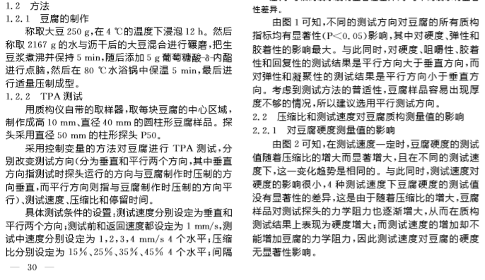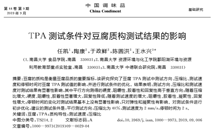 Technical articles2019年9月,《中国调味品》期刊在线发表了南昌大学题为“TPA测试条件对豆腐质构测试结果的影响”的文章,在文章中,研究人员使用上海腾拔Universal TA质构仪测定豆腐的硬度、弹性、回复性、咀嚼性等指标。