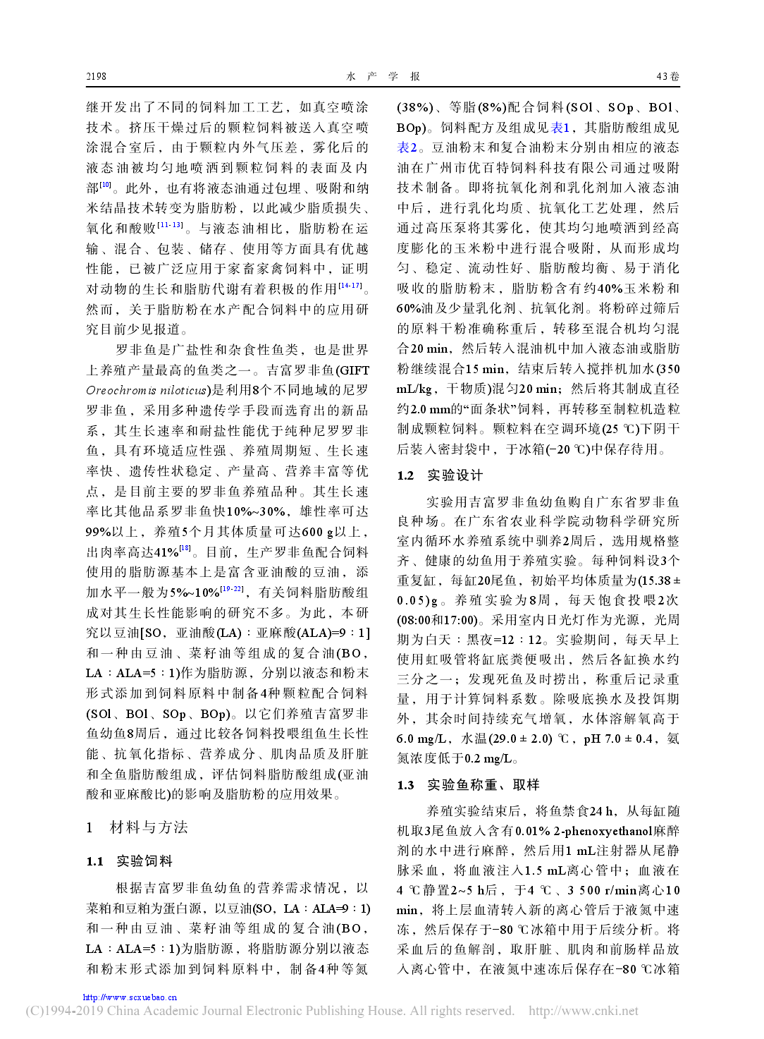 摘要:在目前的水产配合饲料生产中,油脂一般以液态形式添加到饲料原料中或者在真 空环境中喷涂到饲料颗粒上,以脂肪粉进行应用的研究报道很少。本研究以豆油(SO, 亚油酸∶亚麻酸=9∶1)和一种由豆油和菜籽油等组成的复合油(BO,亚油酸∶亚麻 酸=5∶1)为脂肪源,分别以液态和粉末形式添加到饲料原料中制备4种配合饲料(SOl、 BOl、SOp、BOp)。用其在室内水族箱中喂养初始平均体质量为15.38 g的吉富罗非鱼幼 鱼8周后,各饲料投喂组鱼的增重率、特定生长率、饲料系数、肝体比、脏体比无显著 性差异。与豆油饲料(SOl)投喂组鱼相比,SOp组的肝脏过氧化氢酶及超氧化物岐化酶活 性显著升高、肌肉粗灰分含量显著降低,SOp、BOl、BOp组的血清甘油三酯和低密度脂 蛋白水平、全鱼的水分含量都显著降低,肝脏总抗氧化能力、全鱼粗蛋白含量及肌肉剪 切力都显著升高。此外,BOp组的血清过氧化氢酶活性及肌肉硬度显著高于SOl、BOl、 SOp组。肝脏和肌肉的脂肪酸组成各组间差异不大,均反映饲料的脂肪酸组成。研究表 明,与液态油相比,脂肪粉饲料对吉富罗非鱼幼鱼的生长无不良影响,且可改善鱼的健 康及肌肉品质;复合油的效果优于豆油。结合脂肪粉具有包装、运输、储存、添加方便 等优点,值得在水产养殖生产中进行推广应用。