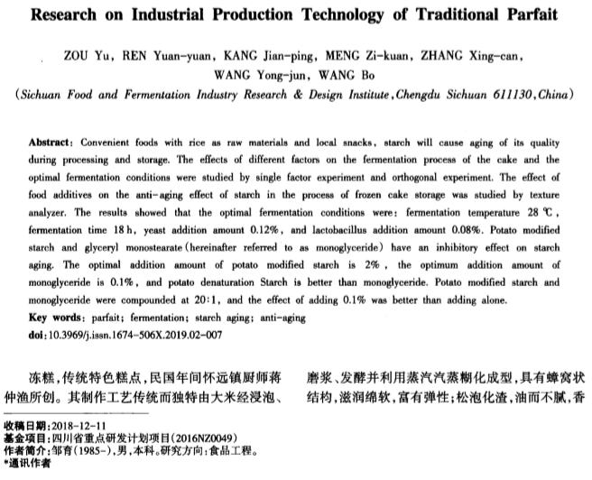 2019年,《食品与发酵科技》期刊在线发表了四川省食品发酵工业研究设计院题为“传统冻糕工业化生产技术研究”的文章,在文章中,研究人员使用上海腾拔Universal TA质构仪测定传统冻糕的硬度、弹性、回复性等指标。