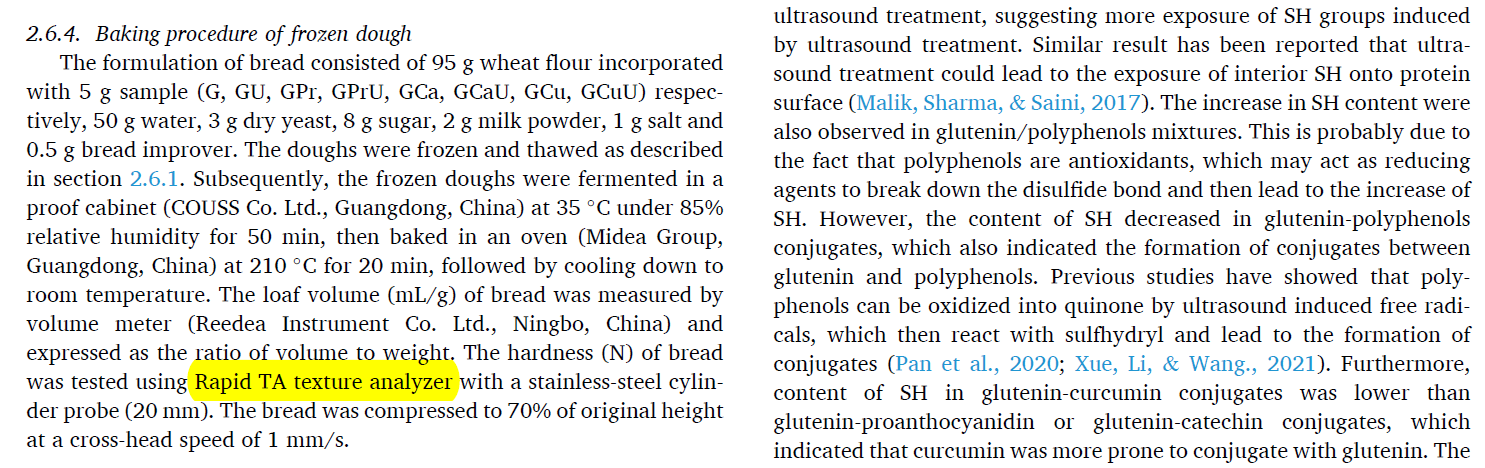Technical articles近期,南京中医药大学药学院和南京工业大学食品与轻工学院研究人员在国际食品期刊《LWT - Food Science and Technology》发表了题为"Prevention of frozen-dough from deterioration with incorporation of glutenin-polyphenols conjugates prepared by ultrasound"的研究论文。在该研究论文中,研究人员利用上海腾拔Rapid TA质构仪测定冷冻面团面包的硬度。
