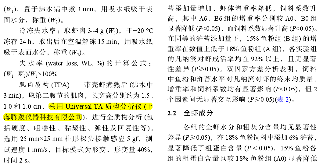 Technical articles2021年,上海海洋大学研究人员在国内期刊《水产学报》在线发表了题为“饲料中添加浒苔对凡纳滨对虾生长性能和肌肉品质的影响”的研究文章。在该论文中,研究人员使用上海腾拔仪器科技有限公司的Universal TA质构仪来测定凡纳滨对虾的硬度、弹性、咀嚼性、黏聚性和回复性。